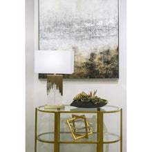 The Blain Console Table is a three-tier display table with an oval shape and clear tempered glass shelves. The frame is made from a brass tone finished metal. This console table can be used to display books and decorative items, and works in a variety of room settings, including an entry way, dining room or living room.