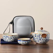 Blue and white beige Ru kiln travel tea set one pot three cups outdoor portable entwined lotus ceramic retro teapot
