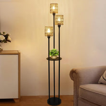 Boho Floor Lamp with Shelves 3-Lights Farmhouse Tall Floor Lamp with ON/OFF Foot Switch Rustic Standing Lamp with Rattan Shades