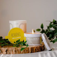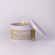 - Our smaller Brilliance candle comes in a white tin for convenient travel. Each of the smaller candles has an estimated 35-hour burn time and a net weight of 6 oz.