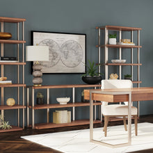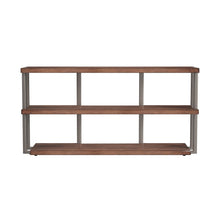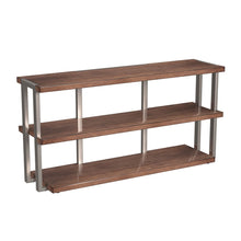 The Brooke Console has a slick, modern styling with mid-century elements featuring inset metal frames and a top, center and bottom surface.