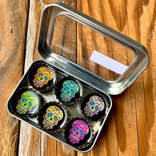 Six-pack set of Calaveras themed magnets, made in the USA from recycled bottle caps. Our magnetic expressions make fabulous and unique gifts and can be used in the kitchen, office or on any magnetic surface.
