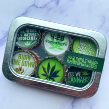 Six-pack set of cannabis themed magnets, made in the USA from recycled bottle caps. our magnetic expressions make fabulous and unique gifts and can be used in the kitchen, office or on any magnetic surface.