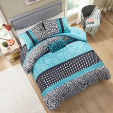 Fiercely fashionable, the Mi Zone Chloe Comforter Set delivers an invigorating update to your bedroom. The comforter features polka dots, a damask motif, and leopard print in a bold color palette of black, white, and teal. The solid teal reverse provides a pleasant relief to the chic design, while matching shams (1 for Twin/Twin XL) complete this bold look. A decorative pillow with embroidered details and fabric manipulation add the finishing flare to this fun comforter set. Comforter and shams (1 for Twin/Twin XL) are machine washable. This bedding set is OEKO-TEX certified, meaning it does not contain any harmful substances or chemicals, and uses an antimicrobial treatment that provides built-in freshness protection, reducing the growth of odor causing bacteria to keep fabric lasting longer.