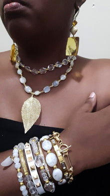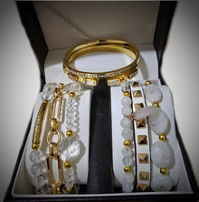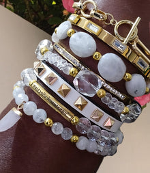We call this the " Master Healer Stack". This stack of bracelet is paired perfectly, giving a sense of a purity and clarity look.This set is made with grade AAA clear quartz beads, 6mm moonstone beads, and irregular shaped round moonstone beads. Each beaded bracelet is accented with 4mm stainless steel beads. This set comes with a belt bucklet bracelet, toggle clasp stainless steel link bracelet, and stainless steel bangles with clear crystal accents.