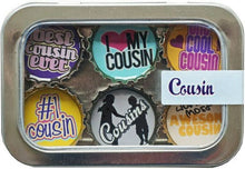 Six-pack set of cousin themed magnets, made in the USA from recycled bottle caps. our magnetic expressions make fabulous and unique gifts and can be used in the kitchen, office or on any magnetic surface. Each magnet set comes in the display tin (just like in the picture) and the magnets are strong enough to hold the entire tin on a magnetic surface for display.
