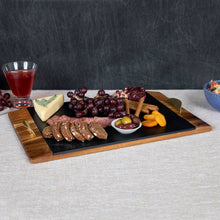 You love charcuterie, we love charcuterie, and for those people in your life that have never been blessed with it, you'll want their first time to be on the Covina Serving Tray. The Covina has a modern look with soft rounded edges on the acacia wood tray, and a removable slate serving board. This beautiful tray has four foam feet on the bottom side so that your meats and cheeses will stay safely where you set them, and the whole thing is easily carried around by the two rounded satin brass-toned handles. If you're going to a party, hosting one, or enjoying a Friday night mixer for one, knock up the taste and style with the Covina Serving Tray, because everything is better on slate.