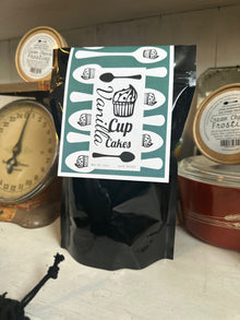VANILLA CUPCAKE MIX - Black Standup Pouch (makes six good-sized cupcakes) INGREDIENTS: Wheat Flour Enriched (niacin, reduced iron, thiamine, mononitrate, riboflavin, folic acid), Malted Barley Flour, Cane Sugar, Vanilla Extract, Orange Extract (alcohol, water, and pure orange oil), and Kosher Salt.