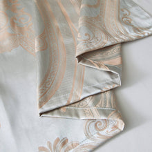 Decorate your window with style and sophistication with these luxury semi-blackout Jacquard fabric curtain panels featuring Silver/Green background and gold geometric shapes.