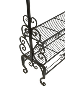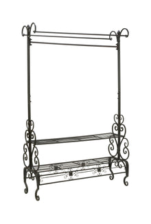 Organize your space using this Dark Brown Garment Rack. The piece features beautiful accented designs for an elegant sophistication perfect for clothes on hangers, draping linens, table cloths, runners and quilts. Feature scarves, clothes, and other fashion accessories. The two shelves offer a great space for storage and organization. The elegant and functional design of the rack keeps items concise and organized. Perfect for events, store, and home.
