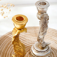 Elegant feather-shaped candle holders with a metallic finish, perfect for adding a touch of luxury and artistic charm to any tabletop or mantel. Gold: 3.07"D x 8.14"H Silver: