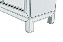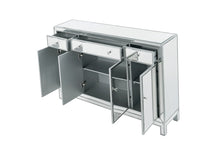 In bold symmetry, measuring W56xD13xH36”, this contemporary piece can decorate any narrow hallway or dinning room and still yield plenty of storage space. With the gleaming beveled mirror surfaces, it opens up the visual space in the room while imbuing it with glamour. The crystal door knobs exude sheer elegance. FEATURES: *Reflexion collection *3 drawers and 4 doors * crystal knobs *Hand painted silver finish *Beveled mirror panel *Solid wood trim and legs *Wood drawer glides *Inside lining painted in silver. PRODUCT DETAILS: Measurement W56xD13xH36” *No assembly required *Material in solid wood and engineered wood * 1 year limited warranty.