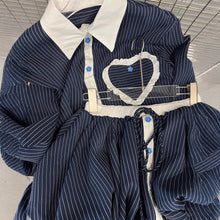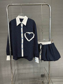 Fashion contrasting polo collar heart striped shirt top women's spring floral bud fluffy half skirt two-piece set