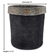 Our wool felt storage baskets are hand felted with high quality New Zealand wool that is about 8 mm thick and they have a height of 32 cm high and a diameter of 28 cm.