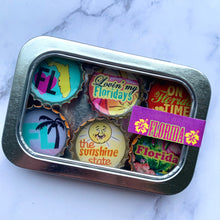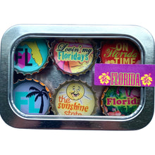 Six-pack set of Florida themed magnets, made in the USA from recycled bottle caps. our magnetic expressions make fabulous and unique gifts and can be used in the kitchen, office or on any magnetic surface.