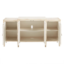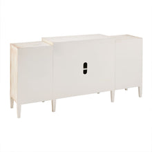 Introduce a natural elegance to your decor with the Madison Park Folio Buffet. Featuring an antique white and silver leaf wood finish, this buffet provides plenty of space to store your flatware and glasses. The four doors stay securely shut with magnetic catches and open up to reveal an adjustable shelf. Beautifully crafted with silver trim work, this wood buffet adds a luxurious look to your dining room. Assembly is required.