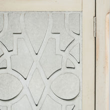 *Manufactured Wood Frame *Solid Wood Legs *Antique White And Silver Leaf Wood Finish *Top Size Center Top:34"W x 18"D x 1"T; Side Top:17"W x 16"D x 1"T *3pc Shelf Qty *Doors Included *Magnetic Door Catches *Assembly Included