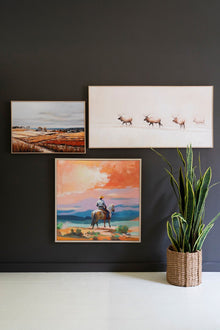 The bright Western landscape fills this framed acrylic painting. A Cowboy atop his horse gazes into the mountainous sunset. You'll need this for a Western theme or any wall that needs a color lift.