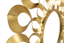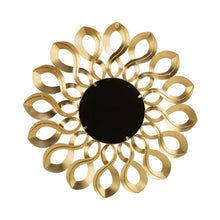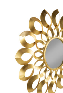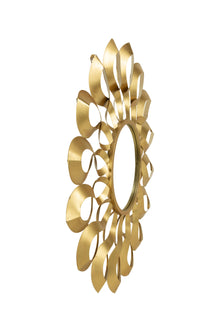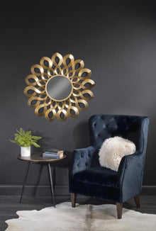 This gold foil mirror with an elegant design is 36" in diameter and features a 12" diameter mirror. It weighs 7.2 pounds. This stunning mirror will be the center of attention in any space. Easy to hang.