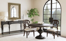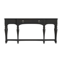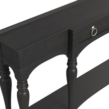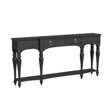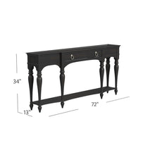 The Grimes Grand Console has an espresso finish highlights fancy turned legs, shaped shelf and drawer.