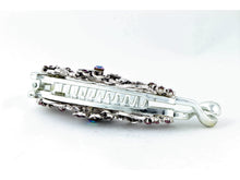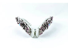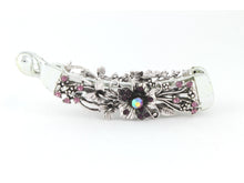 Gun metal color banana hair clip with dark violet flowers.