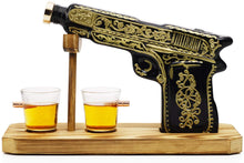 - DRINKING WHISKEY WILL NEVER BE THE SAME: Pistol Gun Decanter & 2 shot glasses paired with a wooden display stand. Can you imagine how classy this will look in your bar? This hand painted whiskey decanter gun will start your drinking with a bang. The black paint with the gold accents are sure to be a wonderful addition to any home bar.