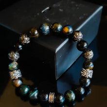 3pc. Bracelet set made with natural blue tiger , onyx, and metallic lava beads with stainless steel spacers. Comes with a stainless steel bracelet and a genuine leather bracelet.