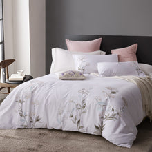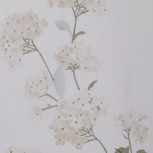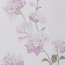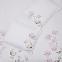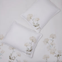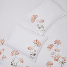 Lush hydrangeas are embroidered on a white background. Matching pillow shams complete this elegant look.