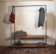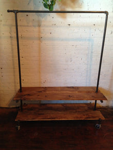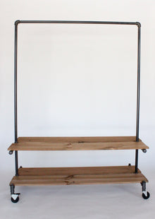 Clothing rack with plenty of storage space. Two levels of shelving. The clothing rack can be assembled by hand in short period of time. The platforms are removable. The cross bar is 4ft long, the depth of the axels are 22" and it stands about 67" from the floor. The wheels have breaks. Hook at the end of the rack for bags, hats or outfits (optional).