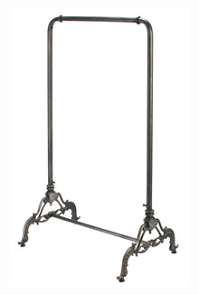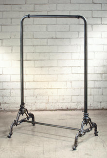 Create an elegant look with an Industrial Clothing Rack. Featuring a dark charcoal painted finish and wide tube metal construction, this rack is perfect for storing coats, scarves and all types of clothing. This rack is the perfect solution to a lack of space, or for additional hanging space for parties and events. Featuring detailed legs and a heavy cast iron base. Each piece is handcrafted which may lead to slight visual imperfections in the overall finish. Simple Assembly.