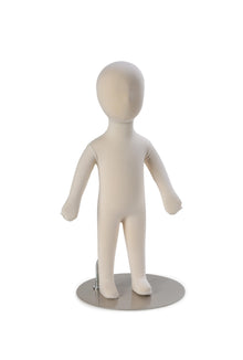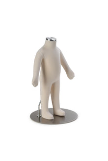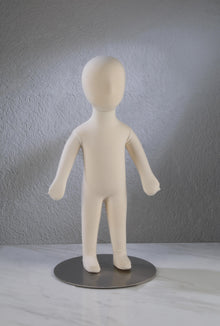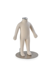 The infant body form is similar in size to a 3 month old baby. It features a foam body, adjustable arms and a removable head and a silver cap so the head can be used separately from the body. The infant is 25.5" tall including the head and 19" tall when using just the steel cap. It features a cream colored, durable cotton fabric and a sturdy weighted chrome metal base. Some basic assembly is necessary.