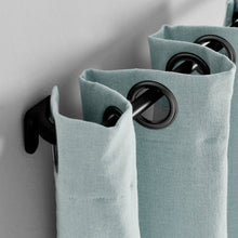 The Insulated Grommet Blackout Faux Linen Window Curtain Panel hangs easily with metal grommets that measure about 1.6 inches in diameter. Simply slide the rod through the grommets and you're all set.