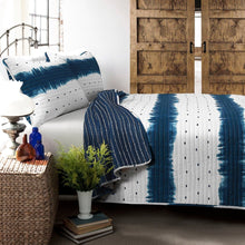 The reverse side of the Jane Shibori 3 Piece Quilt Set features a simple white stripe pattern on solid navy blue to complement the front.