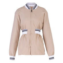 The 'Kamala' jacket has a feminine bomber silhouette with ribbed waist detail. Made from quick-dry & breathable recycled plastic fabric with a liquid-repellent feature. The slightly oversized cut slips on easily over your lightweight sweaters and shirts, making it just the perfect choice as a daily jacket or a cover-up after a beach or pool session.