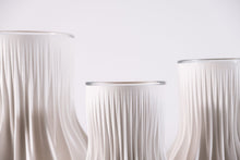The Lamella Vase and Planter consists of 3D printed pots with a glass insert, that are available in three different sizes.They are inspired by the lamellas and gills of fungi and are digitally designed and generated through an algorithm. The ripples vary in depth and gradient and blend together towards the top and bottom of the shapes, they emphasize the uniqueness of natural objects, where no two are alike.