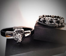 This set is made with 8mm onyx beads , faceted and smooth silver hematite beads. Both strands. Comes with genuine leather bracelet with lions head. Men wear jewelry too ! By with style and uniqueness!