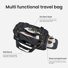 The travel bag can be worn cross-body or handheld and has multiple compartments, a wet/dry compartment and a shoe compartment, so items have their own place and you don't have to worry about shoes or wet towels dirtying your clean clothes.