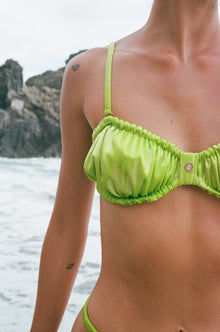 This bikini top features adjustable all-around ruching and cinching at the center tab for a sleek fit. It can be worn with straps or as a strapless bandeau, crafted from a luxurious satin finish fabric for a smooth and soft sheen. The double-layer construction adds extra coverage and support while ensuring it is non-transparent. The fabric is carefully chosen to ensure comfort and a premium look. Shell and lining 90% polyester, 10% spandex.