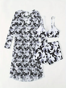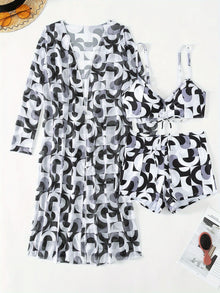Luxe Lines 3-Piece Geometric Bikini Set for Women – High Rise Drawstring Bikini with Boxer Shorts & Long Sleeve Sheer Kimono Cover-Up – Bold & Breezy Women’s Swimwear for Summer Beach Pool & Getaways
