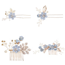 Luxury Blue Flower Hair Combs Headdress Prom Bridal Wedding Hair Accessories Gold Leaves Hair Jewelry Hair Pins