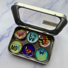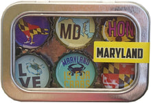 Six-pack set of Maryland themed magnets, made in the USA from recycled bottle caps. our magnetic expressions make fabulous and unique gifts and can be used in the kitchen, office or on any magnetic surface.