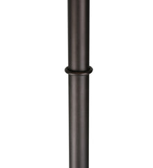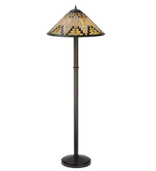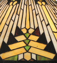 Warm earth toned Bone Beige and Moccasin Tan stained glass; accented with glistening Root Brown and Sage Green; is used to make this intricate pattern of interlocking glass. A floor base in a hand applied Mahogany Bronze finish supports the handsome conical shade inspired by historic American artwork. Handcrafted with the copper foil technique developed by Louis Comfort Tiffany; this imported lamp is a true masterpiece.