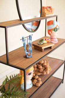 This display shelf combines warm wood, sturdy metal, and a simple round mirror to create a balanced, thoughtful design. The open shelves are perfect for plants, candles, or collected objects, while the mirror adds light and softness. A practical yet artful piece that fits naturally into hallways, bathrooms, or bedrooms.