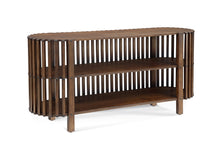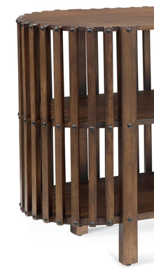 This Bassett Mirror console table features a blend of rustic industrial and mid-century styling. It is made of brown wood slats with nailhead detail along the outside. The table has two exposed interior shelves and four legs with adjustable levelers. It ships fully assembled and requires no assembly. The console table is perfect for adding a touch of style to your living room.