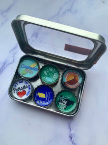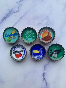 Newly updated with the correct abbreviation of NE. Six-pack set of Nebraska themed magnets, made in the USA from recycled bottle caps. our magnetic expressions make fabulous and unique gifts and can be used in the kitchen, office or on any magnetic surface.