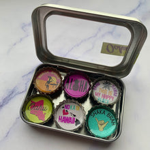 Six-pack set of Oahu themed magnets, made in the USA from recycled bottle caps. our magnetic expressions make fabulous and unique gifts and can be used in the kitchen, office or on any magnetic surface.