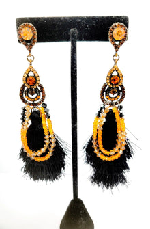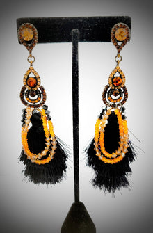 These beautiful tassel earrings is made with black and amber Swarovski crystals and orange Sapphires known as : Padparadscha Sapphire Stone. The base is Cubic Zirconia with Silky black tassel. Padparadscha Its name derives from the Sinhalese named "Lotus Flower," which refers to its yellowish-orange shade. This sapphire is strongly enhancing one 's sexual and artistic powers, and it will spark a "fire of love" within you. Orange Sapphires are very popular and were among the most challenging to identify in such a natural, untreated environment. The shade of many of these orange sapphires does have a primary tone of gold