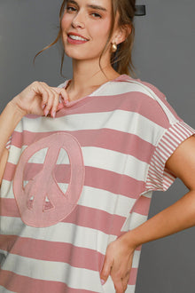 Peace Applique Striped Short Sleeve Mini Dress – Trendy Stripes, Playful Peace Applique, and High-Low Hem for a Chic Casual Look