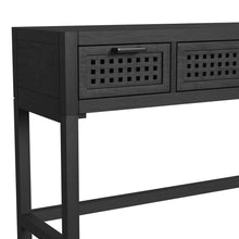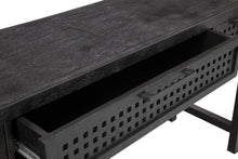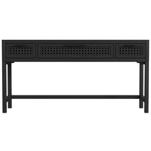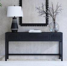 The Pentak Console features a modern Bohemian styling, three drawers with open/pierced fretwork detailing, matte black iron bar pull hardware, constructed with mango solids in a matte black stain.