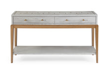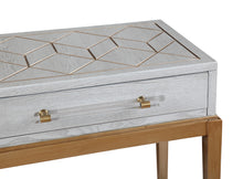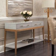 The Perrine Console Table will make the perfect addition for your home. The gold legs pop against the soft graphite gray table top. The top is accented with antique gold geometric inlay design, and custom acrylic hardware for the draw pulls. Includes two drawers and a lower shelf for maximum storage.